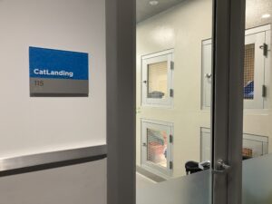 All the cats in this area are adoptable. In front of the cat enclosures, there is an adoption desk where visitors can ask questions about the adoption process. On the second floor, the Guest Experience team is available to assist visitors. This space is designed so that people can interact with animals, even if adoption is not their primary intention.